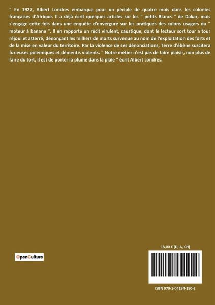 " En 1927, Albert Londres embarque pour un périple de quatre mois dans les colonies françaises d'Afrique. Il a déjà écrit quelques articles sur les " petits Blancs " de Dakar, mais s'engage cette fois dans une enquête d'envergure sur les pratiques des colons usagers du " moteur à banane ". Il en rapporte un récit virulent, caustique, dont le lecteur sort tour a tour réjoui et atterré, dénonçant les milliers de morts survenue au nom de l'exploitation des forts et de la mise en valeur du territoire. Par la violence de ses dénonciations, Terre d'ébène suscitera furieuses polémiques et démentis violents. " Notre métier n'est pas de faire plaisir, non plus de faire du tort, il est de porter la plume dans la plaie " écrit Albert Londres.