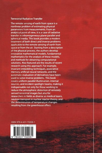 1. Basic Concepts.- 1.1 Introduction.- 1.2 Invariant imbedding and a simple model of reflection.- 1.3 Computation of reflection function.- 1.4 Internal intensity and source functions.- 1.5 Physical/mathematical descriptions.- 1.6 Intensity of radiation and source function.- 1.7 Discussion.- 2. Inhomogeneous Plane-Parallel Atmospheres.- 2.1 Introduction.- 2.2 Diffuse Reflection and Transmission.- 2.3 Computational method and results.- 2.4 Internal Intensity and Source Functions.- 2.5 Internal Emitting Sources.- 2.6 Reflecting Surfaces.- 2.7 Omnidirectional Illumination.- 2.8 Discussion.- 3. Inverse Problems.- 3.1 Introduction.- 3.2 Associative memories.- 3.3 Quasilinearization.- 3.4 FEED automatic derivative evaluation.- 3.5 Inverse problems for inhomogeneous media and effect of criterion on estimates.- 3.6 Other inversion techniques.- 3.7 Discussion.- 4. Anisotropic Scattering.- 4.1 Introduction.- 4.2 Phase function dependent on polar angles.- 4.3 Phase function expandable in Legendre polynomials.- 4.4 Estimation of Phase Function.- 4.5 Flux Equivalences.- 4.6 Three-Dimensional Reflection and Transmission.- 4.7 Concluding Remarks.- 5. Finite Orders of Scattering.- 5.1 Introduction.- 5.2 Scattering and Transmission Functions of Finite Order.- 5.3 The Auxiliary Equation and its Solution.- 5.4 Cumulative Functions.- 5.5 Discussion.- 6. Scattering Matrix.- 6.1 Introduction.- 6.2 The Scattering Matrix.- 6.3 The Homogeneous Medium.- 6.4 The Transport Equation.- 6.5 The Star-Semi-Group.- 6.6 The n Terms Solutions.- 6.7 The Discrete Case.- 6.8 The Time-Dependent Case.- 6.9 Concluding Remarks.- 7. Atmospheric Correction.- 7.1 Introduction.- 7.2 Radiative Processes in the Atmosphere.- 7.3 Atmospheric Correction for Landsat Data.- 7.4 Atmospheric Correction for Aircraft Data.- 7.5Outline of the AECS Software.- 7.6 General Models and Approximations.- 7.7 Results and Discussion.- References.- 8. Topographic Effects in Terrestrial Remote Sensing.- 8.1 Introduction.- 8.2 Flat Terrain.- 8.3 Rugged Terrain.- 8.4 Model Rendering.- 8.5 Topographic and atmospheric correction of satellite data.- 8.6 Discussion.- 9. Searchlight Problem.- 9.1 Introduction.- 9.2 Basic Equations.- 9.3 Equation of Transfer.- 9.4 Asymptotic Solutions.- 9.5 Approximations.- 9.6 Numerical Simulation.- 9.7 Conclusions.- 10. Transfer of Radiation with Spherical Symmetry.- 10.1 Introduction.- 10.2 Intensity and Operations.- 10.3 Transfer of Radiation.- 10.4 Coefficients of the Medium.- 10.5 State and Local Form.- 10.6 The Reflecting Core.- 10.7 Special Cases and Applications.- 10.8 Numerical Solution of Functional Equations for Spherical Geometry.- 10.9 Numerical Estimation of Derivatives.- 10. 10 Perturbation Approximation.- 10.11 Numerical Results.- 10.12 Discussion.- 11. Bibliography.- A. Appendix A.- The Physical Problem of Radiative Transfer.- A.1 The Intensity of Radiation.- A.2 The Absorption and the Scattering Coefficients.- A.3 The Phase Function.- A.4 The Emission Coefficient, The Mean Intensity and the Source Function.- A.5 The Net Flux and the Density of Radiation.- A.6 The Equation of Transfer.- A.7 Discussion.- References.- B. Appendix B.- Derivation and Validation of Imbedding Equations.- B.1 Introduction.- B.2 Source Function.- B.2.1 Integral equation.- B.2.2 Derivation of the integral equation.- B.2.4 Analytical derivation of the imbedding equations.- B.3 Reflected Intensities.- B.3.2 Imbedding equations.- B.4 Internal Intensities.- B.4.1 Introduction.- B.4.2 Imbedding equations.- B.4.3 Discussion.- B.5 The Fredholm Resolvent.- B.5.1 Resolvent for Fredholm integralequations.- B.5.2 Resolvent for radiative transfer in a homogeneous slab.- B.5.3 Invariant imbedding for the resolvent.- B.6 Discussion.- References.- C. Appendix C.- Greenhouse Effect.- C.1 Introduction.- C.2 Integral Equation for Source Function.- C.3 Invariant Imbedding.- C.4 Computational Method.- C.5 Computational Results.- References.- D. Appendix D.- Identification of an Atmospheric Medium.- D.1 Introduction.- D.3 Scattering Matrix from Inputs and Outputs.- D.4 Relationship between Scattering Matrices.- D.5 Conclusion.- References.