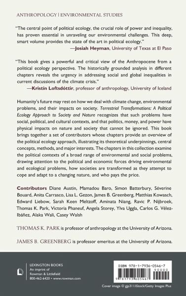 Humanity’s future may rest on how we deal with climate change, environmental problems, and their impacts on society. Terrestrial Transformations: A Political Ecology Approach to Society and Nature recognizes that such problems have social, political, and cultural contexts, and that politics, money, and power have physical impacts on nature and society that cannot be ignored. This book brings together a set of chapters that provide an overview of the political ecology approach, illustrating its theoretical underpinnings, central concepts, methods, and major interests. The authors examine the political contexts of a broad range of environmental and social problems, drawing attention to the political and economic forces driving environmental and ecological problems, how societies are transformed as they attempt to cope and adapt to a changing nature, and who pays the price.