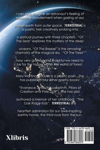 I can only imagine an astronaut's feeling of awesome wonderment when gazing at our planet earth from outer space. TERRESTRIAL is a poetic trek creatively probing into a spiritual journey with three chapters. "Of The Seas" explores the mystery of the deep oceans. "Of The Breeze" is the amazing chemistry of the magical sky. "Of The Trees" how very grateful and thankful we need to be for the history within the world of forest.