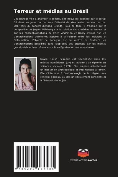 Cet ouvrage vise à analyser le contenu des nouvelles publiées par le portail G1 dans les jours qui ont suivi l'attentat de Manchester, survenu en mai 2017 lors du concert d'Ariana Grande. Pour ce faire, il s'appuie sur la perspective de Jaques Wainberg sur la relation entre médias et terreur et sur les conceptualisations de Chris Anderson et Henry Jenkins sur les transformations qu'internet apporte à la relation entre les individus et l'information. L'objectif de l'analyse est de mettre en évidence les transformations possibles dans l'approche des attentats par les médias grand public et leur influence sur la catégorisation des musulmans.