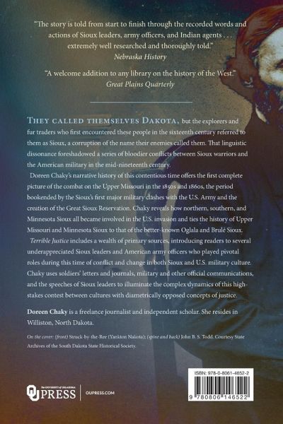 Great Plains Distinguished Book Prize-Center for Great Plains Studies (finalist) Spur Award-Best Western Nonfiction Historical Book-Western Writers of America (finalist) The first complete account of Sioux conflict and transformation before 1870 They called themselves Dakota, but the explorers and fur traders who first encountered these people in the sixteenth century referred to them as Sioux, a corruption of the name their enemies called them. That linguistic dissonance foreshadowed a series of bloodier conflicts between Sioux warriors and the American military in the mid-nineteenth century. Doreen Chaky's narrative history of this contentious time offers the first complete picture of the conflicts on the Upper Missouri in the 1850s and 1860s, the period bookended by the Sioux's first major military conflicts with the U.S. Army and the creation of the Great Sioux Reservation. Terrible Justice explores not only relations between the Sioux and their opponents but also the discord among Sioux bands themselves. Moving beyond earlier historians' focus on the Brulé and Oglala bands, Chaky examines how the northern, southern, and Minnesota Sioux bands all became involved in and were affected by the U.S. invasion. In this way Terrible Justice ties Upper Missouri and Minnesota Sioux history to better-known Oglala and Brulé Sioux history. Making use of a wealth of primary sources, many of them not accessed in earlier accounts, Chaky introduces readers to several underappreciated Sioux leaders and American army officers who played pivotal roles during this time of conflict and change in both Sioux and U.S. military culture. She uses soldiers' letters and journals, military and other official communications, and the speeches of Sioux leaders to illuminate the complex dynamics of this high-stakes contest between cultures with diametrically opposed concepts of justice. Doreen Chaky is a freelance journalist and independent scholar. She resides in Williston, North Dakota.