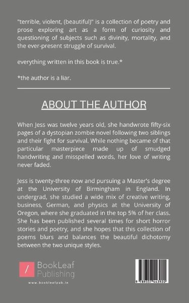 """"""terrible, violent, (beautiful)"""" is a collection of poetry and prose exploring art as a form of curiosity and questioning of subjects such as divinity, mortality, and the ever-present struggle of survival. everything written in this book is true.* *the author is a liar.""