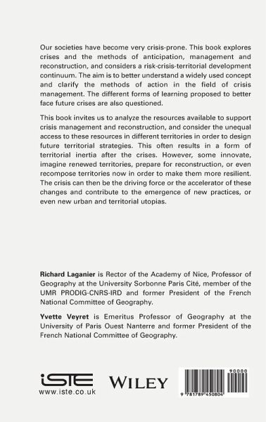 Our societies have become very crisis-prone. This book explores crises and the methods of anticipation, management and reconstruction, and considers a risk-crisis-territorial development continuum. The aim is to better understand a widely used concept and clarify the methods of action in the field of crisis management. The different forms of learning proposed to better face future crises are also questioned. This book invites us to analyze the resources available to support crisis management and reconstruction, and consider the unequal access to these resources in different territories in order to design future territorial strategies. This often results in a form of territorial inertia after the crises. However, some innovate, imagine renewed territories, prepare for reconstruction, or even recompose territories now in order to make them more resilient. The crisis can then be the driving force or the accelerator of these changes and contribute to the emergence of new practices, or even new urban and territorial utopias.