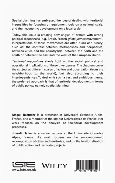Spatial planning has embraced the idea of dealing with territorial inequalities by focusing on equipment logic on a national scale, and then economic development on a local scale. Today, this issue is creating new angles of debate with strong political resonances (e.g. Brexit, French gilets jaunes movement). Interpretations of these movements are often quick and binary, such as: the contrast between metropolises and peripheries, between cities and the countryside, between the north and the south or between the east and the west of the European Union. Territorial Inequalities sheds light on the social, political and operational implications of these divergences. The chapters cover the subject at different scales of action and observation (from the neighborhood to the world), but also according to their interdependences. To deal with such a vast and ambitious theme, the preferred approach is that of territorial development in terms of public policy, namely spatial planning.