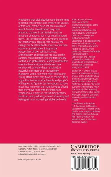 1. Territoriality and conflict in an era of globalization Miles Kahler; 2. Bounded communities: territoriality, territorial attachment, and conflict H. E. Goemans; 3. On giving ground: globalization, religion, and territorial detachment in a Papua New Guinea society Joel Robbins; 4. The resilience of territorial conflict in an era of globalization David Newman; 5. Diasporas and homeland conflict Terrence Lyons; 6. Territory and war: state size and patterns of interstate conflict David A. Lake and Angela O'Mahony; 7. Globalization, economic development, and territorial conflict Erik Gartzke; 8. The death of distance? The globalization of armed conflict Halvard Buhaug and Nils Petter Gleditsch; 9. The evolution of territoriality: international relations and American law Kal Raustiala; 10. Trade and territorial conflict in Latin America: international borders as institutions Beth A. Simmons; 11. Conclusion Barbara F. Walter.
