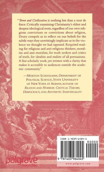 ' Terror and Civilization is nothing less than a tour de force . Critically examining Christianity's oldest and deepest ideological roots, regardless of our own religious convictions or convictions about religion Drury compels us to reflect on our beliefs for the subtle ways they unwittingly implicate us in the violence we thought we had opposed. Required reading for religious and anti-religious thinkers, moralists and anti-moralists, for truth seekers and critics of truth, for idealists and realists of all persuasions. A fine scholarly work, yet written with a clarity that makes it accessible to audiences outside the academic community.' - Morton Schoolman, SUNY Albany, USA