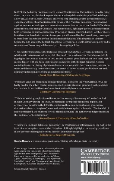 In 1970, the Red Army Faction declared war on West Germany. The militants failed to bring down the state, but this book argues that the decade-long debate they inspired helped shape a new era. After 1945, West Germans answered long-standing doubts about democracy's viability and fears of authoritarian state power with a 'militant democracy' empowered against its enemies and a popular commitment to anti-fascist resistance. In the 1970s, these postwar solutions brought Germans into open conflict, fighting to protect democracy from both terrorism and state overreaction. Drawing on diverse sources, Karrin Hanshew shows how Germans, faced with a state of emergency and haunted by their own history, managed to learn from the past and defuse this adversarial dynamic. This negotiation of terror helped them to accept the Federal Republic of Germany as a stable, reformable polity and to reconceive of democracy's defence as part of everyday politics.