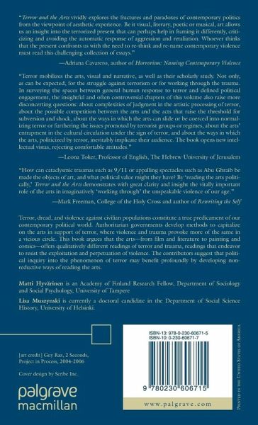 "Terror mobilizes the arts, visual and narrative, as well as their scholarly study. Not only, as can be expected, for the struggle against terrorism or for working through the trauma. In surveying the spaces between general human response to terror and defined political engagement, the insightful and often controversial chapters of this volume also raise more disconcerting questions: about complexities of judgment in the artistic processing of terror, about the possible competition between the arts and the acts that raise the threshold for subversion and shock, about the ways in which the arts can slide or be coerced into normalizing terror or furthering the issues promoted by terrorist groups or regimes, about the arts entrapment in the cultural circulation under the sign of terror, and about the ways in which the arts, politicized by terror, inevitably implicate their audience. The book opens new intellectual vistas, rejecting comfortable attitudes." - Leona Toker, Professor of English, The Hebrew University of Jerusalem