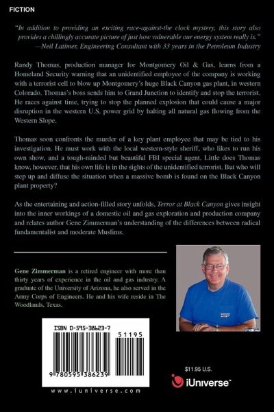 "In addition to providing an exciting race-against-the clock mystery, this story also provides a chillingly accurate picture of just how vulnerable our energy system really is." -Neil Latimer, Engineering Consultant with 33 years in the Petroleum Industry Randy Thomas, production manager for Montgomery Oil & Gas, learns from a Homeland Security warning that an unidentified employee of the company is working with a terrorist cell to blow up Montgomery's huge Black Canyon gas plant, in western Colorado. Thomas's boss sends him to Grand Junction to identify and stop the terrorist. He races against time, trying to stop the planned explosion that could cause a major disruption in the western U.S. power grid by halting all natural gas flowing from the Western Slope. Thomas soon confronts the murder of a key plant employee that may be tied to his investigation. He must work with the local western-style sheriff, who likes to run his own show, and a tough-minded but beautiful FBI special agent. Little does Thomas know, however, that his own life is in the sights of the unidentified terrorist. But who will step up and diffuse the situation when a massive bomb is found on the Black Canyon plant property? As the entertaining and action-filled story unfolds, Terror at Black Canyon gives insight into the inner workings of a domestic oil and gas exploration and production company and relates author Gene Zimmerman's understanding of the differences between radical fundamentalist and moderate Muslims.