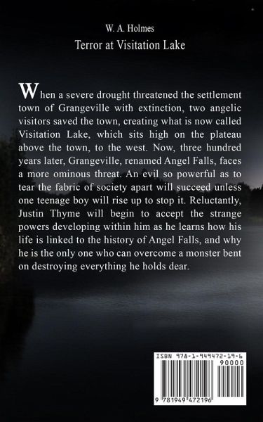 When a severe drought threatened the settlement town of Grangeville with extinction, two angelic visitors saved the town, creating what is now called Visitation Lake, which sits high on the plateau above the town, to the west. Now, three hundred years later, Grangeville, renamed Angel Falls, faces a more ominous threat. An evil so powerful as to tear the fabric of society apart will succeed unless one teenage boy will rise up to stop it. Reluctantly, Justin Thyme will begin to accept the strange powers developing within him as he learns how his life is linked to the history of Angel Falls, and why he is the only one who can overcome a monster bent on destroying everything he holds dear.