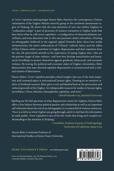 In Terror Capitalism anthropologist Darren Byler theorizes the contemporary Chinese colonization of the Uyghur Muslim minority group in the northwest autonomous region of Xinjiang. He shows that the mass detention of over one million Uyghurs in "reeducation camps" is part of processes of resource extraction in Uyghur lands that have led to what he calls terror capitalism-a configuration of ethnoracialization, surveillance, and mass detention that in this case promotes settler colonialism. Drawing on ethnographic fieldwork in the regional capital Ürümchi, Byler shows how media infrastructures, the state's enforcement of "Chinese" cultural values, and the influx of Han Chinese settlers contribute to Uyghur dispossession and their expulsion from the city. He particularly attends to the experiences of young Uyghur men-who are the primary target of state violence-and how they develop masculinities and homosocial friendships to protect themselves against gendered, ethnoracial, and economic violence. By tracing the political and economic stakes of Uyghur colonization, Byler demonstrates that state-directed capitalist dispossession is coconstructed with a colonial relation of domination.