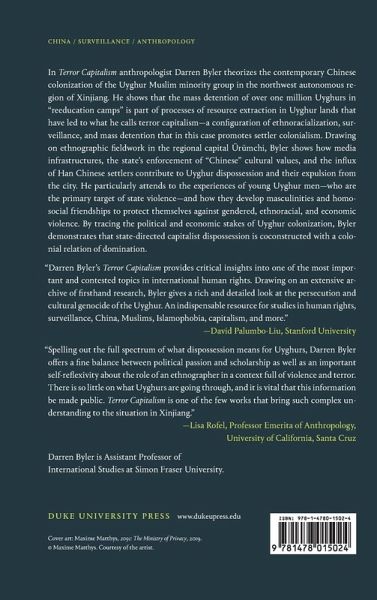 In Terror Capitalism anthropologist Darren Byler theorizes the contemporary Chinese colonization of the Uyghur Muslim minority group in the northwest autonomous region of Xinjiang. He shows that the mass detention of over one million Uyghurs in "reeducation camps" is part of processes of resource extraction in Uyghur lands that have led to what he calls terror capitalism-a configuration of ethnoracialization, surveillance, and mass detention that in this case promotes settler colonialism. Drawing on ethnographic fieldwork in the regional capital Ürümchi, Byler shows how media infrastructures, the state's enforcement of "Chinese" cultural values, and the influx of Han Chinese settlers contribute to Uyghur dispossession and their expulsion from the city. He particularly attends to the experiences of young Uyghur men-who are the primary target of state violence-and how they develop masculinities and homosocial friendships to protect themselves against gendered, ethnoracial, and economic violence. By tracing the political and economic stakes of Uyghur colonization, Byler demonstrates that state-directed capitalist dispossession is coconstructed with a colonial relation of domination.