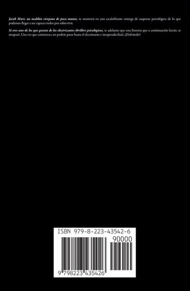 Jacob Mart, un maldito cirujano de poca monta, te mostrará en esta escalofriante entrega de suspense psicológico de lo que podemos llegar a ser capaces todos por sobrevivir. Si eres uno de los que gustan de los electrizantes thrillers psicológicos, te adelanto que esta historia que a continuación leerás; te atrapará. Una vez que comiences, no podrás parar hasta el electrizante e inesperado final. ¡Disfrútalo!
