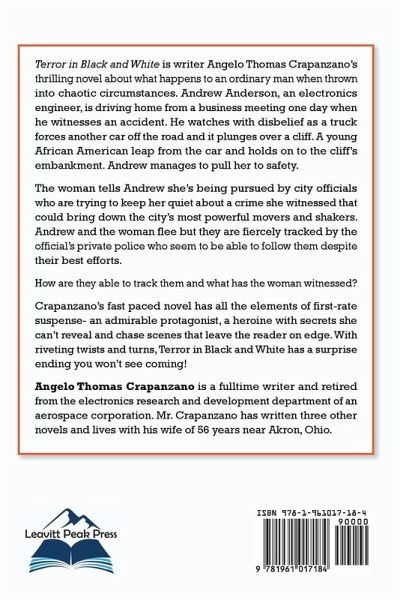 Terror in Black and White is writer Angelo Thomas Crapanzano's thrilling novel about what happens to an ordinary man when thrown into chaotic circumstances. Andrew Anderson, an electronics engineer, is driving home from a business meeting one day when he witnesses an accident. He watches with disbelief as a truck forces another car off the road and it plunges over a cliff. A young African American leap from the car and holds on to the cliff's embankment. Andrew manages to pull her to safety. The woman tells Andrew she's being pursued by city officials who are trying to keep her quiet about a crime she witnessed that could bring down the city's most powerful movers and shakers. Andrew and the woman flee but they are fiercely tracked by the official's private police who seem to be able to follow them despite their best efforts. How are they able to track them and what has the woman witnessed? Crapanzano's fast paced novel has all the elements of first-rate suspense- an admirable protagonist, a heroine with secrets she can't reveal and chase scenes that leave the reader on edge. With riveting twists and turns, Terror in Black and White has a surprise ending you won't see coming!