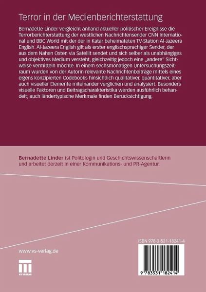 Bernadette Linder beleuchtet anhand aktueller politischer Ereignisse die Terrorberichterstattung der westlichen Nachrichtensender CNN International und BBC World mit der der in Katar beheimateten TV-Station Al-Jazeera English. Al-Jazeera English gilt als erster englischsprachiger Sender, der aus dem Nahen Osten via Satellit sendet und sich selber als unabhängiges und objektives Medium versteht, gleichzeitig jedoch eine "andere" Sichtweise vermitteln möchte. In einem sechsmonatigen Untersuchungszeitraum wurden von der Autorin relevante Nachrichtenbeiträge mittels eines eigens konzipierten Codebooks hinsichtlich qualitativer, quantitativer, aber auch visueller Elemente miteinander verglichen und analysiert. Besonders visuelle Faktoren und Beitragscharakteristika werden ausführlich behandelt; auch ländertypische Merkmale finden Berücksichtigung.