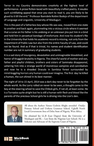 Terror in my Country demonstrates creativity at the highest level of performance. A prose fiction-laced with beautifully crafted poetry. It exudes such scintillating appeal that once you start to read it, you are likely to be glued to it till the end." Professor Bamidele Rotimi Badejo of the department of Language and Linguistics, University of Maiduguri. This is the past of a fatherless boy whose life see-saw, moved from one state to another and back again, plummeting into a vicious circle where it seemed that a curse on his father was his undoing or an unknown jinx put him in a bind and held him in perpetual bondage of misfortune.And now his student's file in the University that holds his academic record is missing, not only from the Department of Public Law but also from the entire Faculty of Law, and could not be found. And as if that is trivial, his name and student identification number are not in the summary of graduating students.It is a sad story of insurgency, devastation and unimaginable bloodshed, and horror of thuggish brutality in Nigeria. The cheerful world of mother and son, father and playful children, brothers and sisters of Saminaka disappeared, ushering him into a strange world of monstrous vampires and cannibalism and now he is a dreaded Dracula in Sambisa forest surrounded by mind-boggling horrors any human could ever imagine. The first day he killed a human, the sun shined in its best manner.The night of 14 to 15 April 2014 was a dark day never to be forgotten by the whole world. As the Lorry rolled on never to be seen, a thought came to the boy at the steering wheel to save the Chibok girls, if not all, at least some. He is a Tornado's quite alright but he is still a human with flesh and blood like the parents of the precious School girls he is driving into the Lion's den.