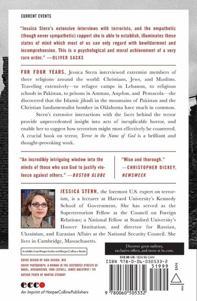 For four years, Jessica Stern interviewed extremist members of three religions around the world: Christians, Jews, and Muslims. Traveling extensively-to refugee camps in Lebanon, to religious schools in Pakistan, to prisons in Amman, Asqelon, and Pensacola-she discovered that the Islamic jihadi in the mountains of Pakistan and the Christian fundamentalist bomber in Oklahoma have much in common.