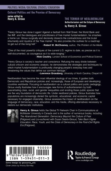 This book argues that neoliberalism is not simply an economic theory but also a set of values, ideologies, and practices that works more like a cultural field that is not only refiguring political and economic power, but eliminating the very categories of the social and political as essential elements of democratic life. Neoliberalism has become the most dangerous ideology of our time. Collapsing the link between corporate power and the state, neoliberalism is putting into place the conditions for a new kind of authoritarianism in which large sections of the population are increasingly denied the symbolic and economic capital necessary for engaged citizenship. Moreover, as corporate power gains a stranglehold on the media, the educational conditions necessary for a democracy are undermined as politics is reduced to a spectacle, essentially both depoliticizing politics and privatizing culture. This series addresses the relationship among culture, power, politics, and democratic struggles. Focusing on how culture offers opportunities that may expand and deepen the prospects for an inclusive democracy, it draws from struggles over the media, youth, political economy, workers, race, feminism, and more, highlighting how each offers a site of both resistance and transformation.