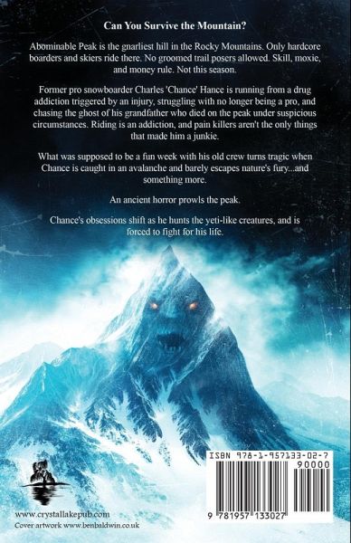 Abominable Peak is the gnarliest hill in the Rocky Mountains. Only hardcore boarders and skiers ride there. No groomed trail posers allowed. Skill, moxie, and money rule. Not this season. Former pro snowboarder Charles 'Chance' Hance is running from a drug addiction triggered by an injury, struggling with no longer being a pro, and chasing the ghost of his grandfather who died on the peak under suspicious circumstances. Riding is an addiction, and pain killers aren't the only things that made him a junkie. What was supposed to be a fun week with his old crew turns tragic when Chance is caught in an avalanche and barely escapes nature's fury...and something more. An ancient horror prowls the peak. Chance's obsessions shift as he hunts the yeti-like creatures, and is forced to fight for his life. Proudly represented by Crystal Lake Publishing-Tales from the Darkest Depths.