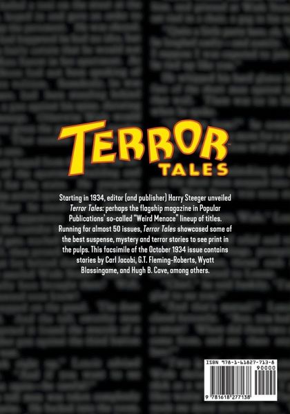 Starting in 1934, editor (and publisher) Harry Steeger unveiled Terror Tales: perhaps the flagship magazine in Popular Publications' so-called "Weird Menace" lineup of titles. Running for almost 50 issues, Terror Tales showcased some of the best suspense, mystery and terror stories to see print in the pulps. This facsimile of the October 1934 issue contains stories by Carl Jacobi, G.T. Fleming-Roberts, Wyatt Blassingame, and Hugh B. Cave, among others.