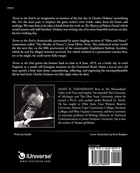 Terror to the End is an imaginative re-creation of the last day in Charles Dickens' astonishing life. For the most part, it employs the great writer's own words, taken from his letters and readings. We meet him as he takes a break from his work on The Mystery of Edwin Drood, which would remain only half-finished. Dickens was writing one of its most beautiful sections on this, his last working day. Terror to the End is dramatically punctuated by spine-tingling sections of "Sikes and Nancy" (sometimes called "The Murder of Nancy"), from Oliver Twist. The celebrated writer would die the next day, on the fifth anniversary of the catastrophic Staplehurst Railway Accident, which he and his alleged mistress survived, but which resulted in a permanent trauma that, try as he might, he could never fully escape. Terror to the End spirits the listener back in time to 8 June, 1870, on a lovely day in rural England, at a stately old Georgian mansion on the Gravesend Road, where a not-so-very old man spends a little time alone, remembering, reflecting, and regretting the incomprehensible life he had lived. Charles Dickens was fifty-eight when he died.