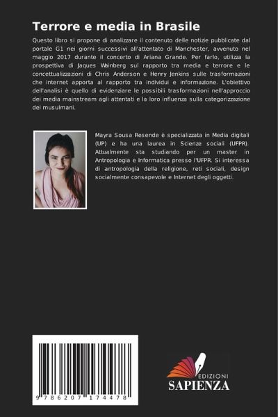 Questo libro si propone di analizzare il contenuto delle notizie pubblicate dal portale G1 nei giorni successivi all'attentato di Manchester, avvenuto nel maggio 2017 durante il concerto di Ariana Grande. Per farlo, utilizza la prospettiva di Jaques Wainberg sul rapporto tra media e terrore e le concettualizzazioni di Chris Anderson e Henry Jenkins sulle trasformazioni che internet apporta al rapporto tra individui e informazione. L'obiettivo dell'analisi è quello di evidenziare le possibili trasformazioni nell'approccio dei media mainstream agli attentati e la loro influenza sulla categorizzazione dei musulmani.