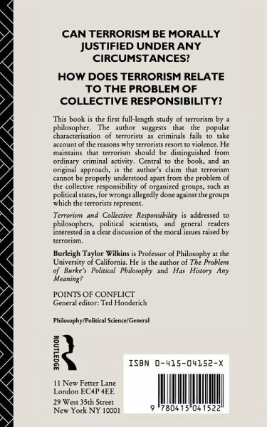 The terrorist threat remains a disturbing issue for the early 1990s. This book explores whether terrorism can ever be morally justifiable and if so under what circumstances. Professor Burleigh Taylor Wilkins suggests that the popular characterisation of terrorists as criminals fails to acknowledge the reasons why terrorists resort to violence. It is argued that terrorism cannot be adequately understood unless the collective responsibility of organised groups, such as political states, for wrongs allegedly done against the groups which the terrorists represent is taken into account. Terrorism and Collective Responsibility provides an analysis of various models of collective responsibility, and it takes into account recent discussions of military responsibility and business ethics. The book also explores the problems that terrorism poses for the just war tradition. The arguments of prominent philosophers against terrorism are critically examined and the claim that terrorism necessarily violates the rights of innocent persons is considered. Wilkins sets forth an original definition of terrorism that is sure to provoke controversy.