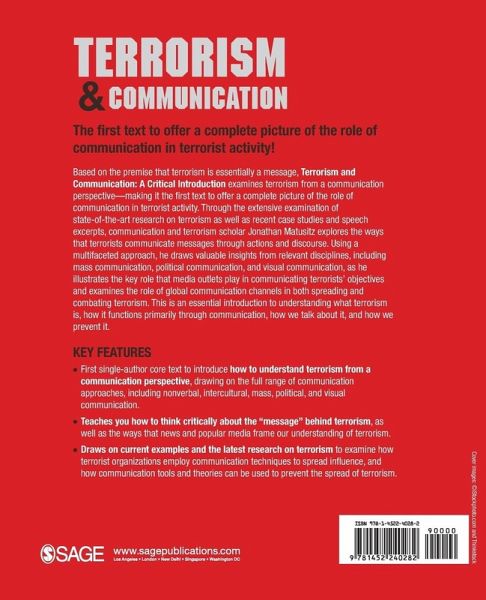 Based on the premise that terrorism is essentially a message, Terrorism and Communication: A Critical Introduction examines terrorism from a communication perspective-making it the first text to offer a complete picture of the role of communication in terrorist activity. Through the extensive examination of state-of-the-art research on terrorism as well as recent case studies and speech excerpts, communication and terrorism scholar Jonathan Matusitz explores the ways that terrorists communicate messages through actions and discourse. Using a multifaceted approach, he draws valuable insights from relevant disciplines, including mass communication, political communication, and visual communication, as he illustrates the key role that media outlets play in communicating terrorists' objectives and examines the role of global communication channels in both spreading and combating terrorism. This is an essential introduction to understanding what terrorism is, how it functions primarily through communication, how we talk about it, and how we prevent it.