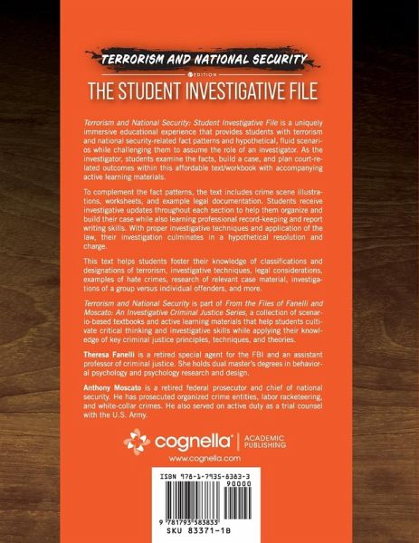 Terrorism and National Security: Student Investigative File is a uniquely immersive educational experience that provides students with terrorism and national security-related fact patterns and hypothetical, fluid scenarios while challenging them to assume the role of an investigator. As the investigator, students examine the facts, build a case, and plan court-related outcomes within this affordable text/workbook with accompanying active learning materials. To complement the fact patterns, the text includes crime scene illustrations, worksheets, and example legal documentation. Students receive investigative updates throughout each section to help them organize and build their case while also learning professional record-keeping and report writing skills. With proper investigative techniques and application of the law, their investigation culminates in a hypothetical resolution and charge. This text helps students foster their knowledge of classifications and designations of terrorism, investigative techniques, legal considerations, examples of hate crimes, research of relevant case material, investigations of a group versus individual offenders, and more. Terrorism and National Security is part of From the Files of Fanelli and Moscato: An Investigative Criminal Justice Series, a collection of scenario-based textbooks and active learning materials that help students cultivate critical thinking and investigative skills while applying their knowledge of key criminal justice principles, techniques, and theories.