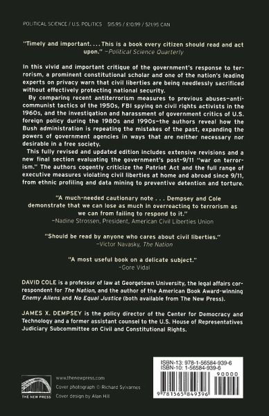 Tracing the history of government intrusions on Constitutional rights in response to threats from abroad, Cole and Dempsey warn that a society in which civil liberties are sacrificed in the name of national security is in fact less secure than one in which they are upheld. A new chapter includes a discussion of domestic spying, preventive detention, the many court challenges to post-9/11 abuses, implementation of the PATRIOT ACT, and efforts to reestablish the checks and balances left behind in the rush to strengthen governmental powers.