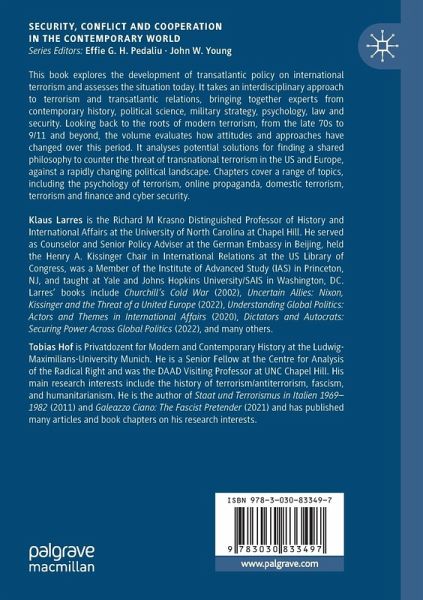This book explores the development of transatlantic policy on international terrorism and assesses the situation today. It takes an interdisciplinary approach to terrorism and transatlantic relations, bringing together experts from contemporary history, political science, military strategy, psychology, law and security. Looking back to the roots of modern terrorism, from the late 70s to 9/11 and beyond, the volume evaluates how attitudes and approaches have changed over this period. It analyses potential solutions for finding a shared philosophy to counter the threat of transnational terrorism in the US and Europe, against a rapidly changing political landscape. Chapters cover a range of topics, including the psychology of terrorism, online propaganda, domestic terrorism, terrorism and finance and cyber security.