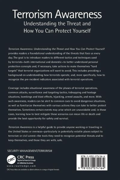Terrorism Awareness: Understanding the Threat and How You Can Protect Yourself provides readers a foundational understanding of the threats that face us every day.The goal is to introduce readers to different tactics and techniques used by terrorists-both international and domestic-to better understand personal protection concepts and, if necessary, take actions to make themselves "hard targets" that terrorist organizations will want to avoid. This includes providing a background on understanding how terrorists operate, and, more specifically, how to recognize the pre-incident indicators associated with terrorist operations.