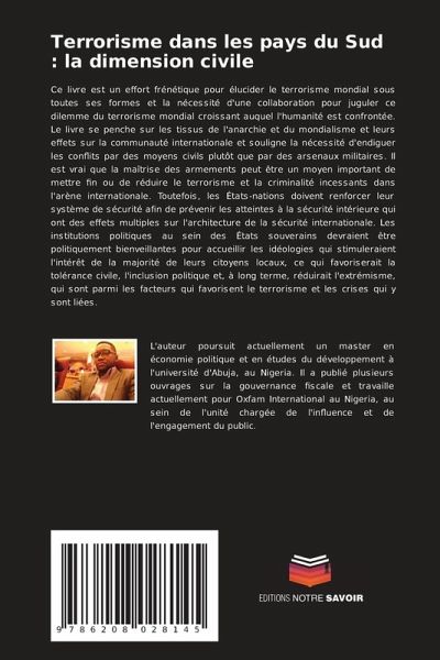 Ce livre est un effort frénétique pour élucider le terrorisme mondial sous toutes ses formes et la nécessité d'une collaboration pour juguler ce dilemme du terrorisme mondial croissant auquel l'humanité est confrontée. Le livre se penche sur les tissus de l'anarchie et du mondialisme et leurs effets sur la communauté internationale et souligne la nécessité d'endiguer les conflits par des moyens civils plutôt que par des arsenaux militaires. Il est vrai que la maîtrise des armements peut être un moyen important de mettre fin ou de réduire le terrorisme et la criminalité incessants dans l'arène internationale. Toutefois, les États-nations doivent renforcer leur système de sécurité afin de prévenir les atteintes à la sécurité intérieure qui ont des effets multiples sur l'architecture de la sécurité internationale. Les institutions politiques au sein des États souverains devraient être politiquement bienveillantes pour accueillir les idéologies qui stimuleraient l'intérêt de la majorité de leurs citoyens locaux, ce qui favoriserait la tolérance civile, l'inclusion politique et, à long terme, réduirait l'extrémisme, qui sont parmi les facteurs qui favorisent le terrorisme et les crises qui y sont liées.
