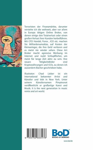 Terroristen der Finanzmärkte, darunter verstehe ich die weltweit, aber vor allem in Europa tätigen Online Broker, von denen einige den Totalverlust oder einen großen Verlust ihrer Kunden herbeiführen. Mit CFD Handel, Forex , ICO etc. machen Sie Milliardenumsätze auf Kosten der Kleinanleger, die ihre Geld verlieren und es meist nie wieder sehen. Diese Art Broker macht aggressive Werbung im Internet und nutzt Schlupflöcher, um meist für lange Zeit aktiv zu sein. Ihre neuen Tätigkeitsfelder sind Kryptowährungen und ICOs, zu denen ich außerdem Bücher geschrieben habe. Illustrator: Chad Lieber ist ein international bekannter Artist und Künstler und lebt in New York. Unter seinem Künstlernamen Pimptronot veröffentlicht er großartige Kunst und Musik. It is the next generation in music remix and art world.