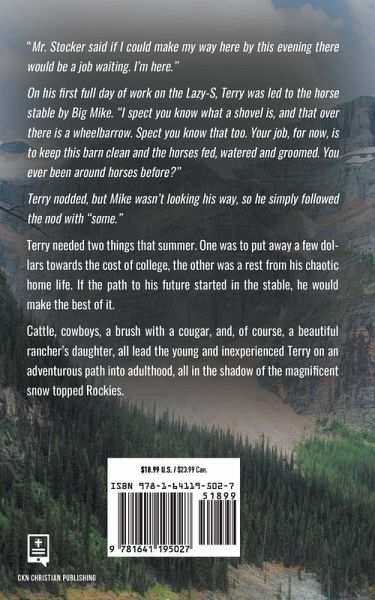 "Mr. Stocker said if I could make my way here by this evening there would be a job waiting. I'm here." On his first full day of work on the Lazy-S, Terry was led to the horse stable by Big Mike. "I spect you know what a shovel is, and that over there is a wheelbarrow. Spect you know that too. Your job, for now, is to keep this barn clean and the horses fed, watered and groomed. You ever been around horses before?" Terry nodded, but Mike wasn't looking his way, so he simply followed the nod with "some." Terry needed two things that summer. One was to put away a few dollars towards the cost of college, the other was a rest from his chaotic home life. If the path to his future started in the stable, he would make the best of it. Cattle, cowboys, a brush with a cougar, and, of course, a beautiful rancher's daughter, all lead the young and inexperienced Terry on an adventurous path into adulthood, all in the shadow of the magnificent snow topped Rockies.