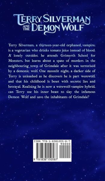 Terry Silverman is a thirteen-year-old orphaned vampire. He's a vegetarian who drinks tomato juice instead of blood and his best friend is a skeleton that sleeps in his closet. A lonely outsider, he attends Grimerth School for Monsters, but learns about a spate of murders in the neighbouring town of Grimdale after it was terrorised by a demonic wolf. One moonlit night, a darker side of Terry is unleashed as he discovers he is part werewolf, and that his childhood is beset with secrets, lies and betrayal. Realising he is now a werewolf-vampire hybrid, can Terry use his inner beast to slay the infamous Demon Wolf and save the inhabitants of Grimdale?
