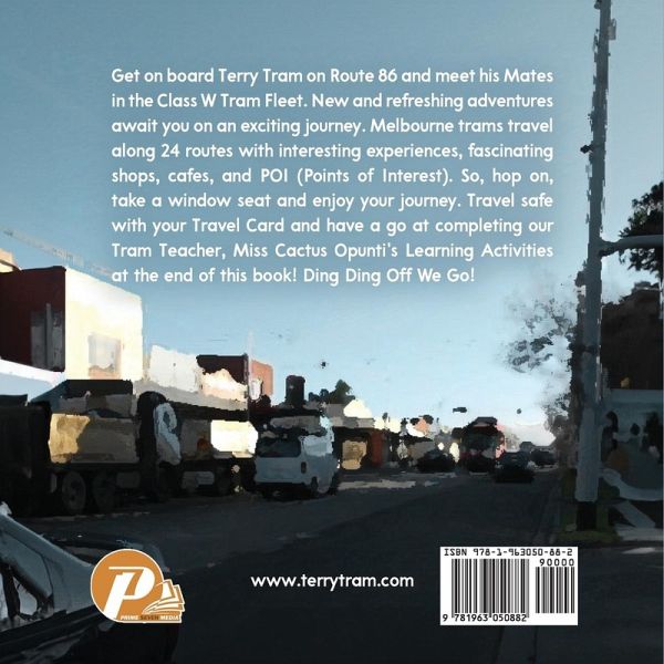 Get on board Terry Tram on Route 86 and meet his Mates in the Class W Tram Fleet. New and refreshing adventures await you on an exciting journey. Melbourne trams travel along 24 routes with interesting experiences, fascinating shops, cafes, and POI (Points of Interest). So, hop on, take a window seat and enjoy your journey. Travel safe with your Travel Card and have a go at completing our Tram Teacher, Miss Cactus Opunti's Learning Activities at the end of this book! Ding Ding Off We Go!
