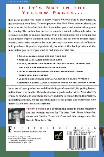 If it's Not in the Yellow Pages ... then it can probably be found in Terry Trucco's Where to Find It. Fully updated, this collection from Terry Trucco's popular New York Times column shows you how to locate hard-to-find, but often invaluable, goods and services throughout the country. The author has uncovered superbly skilled craftspeople who can repair, resuscitate or replace anything, from a broken zipper on a sleeping bag to an antique teapot's shattered spout. You'll also find out how to contact highly creative artists who can solve the most pressing -- and most unusual -- of household problems. Organized alphabetically by subject, this book provides all the information you need if you want to find someone who can: -- build a custom-made bed for your dog -- regrind a damaged binocular lens -- clean, restore and repair an antique clock, an heirloom quilt or a cherished piece of jewelry -- paint a stunning ceiling or make an ordinary wood floor look like marble -- locate discontinued China, flatware or glass patterns -- sharpen a knife, alter a wedding dress or childproof a home In an era of mass production and diminishing craftsmanship, it's getting harder to find those who deal in off-the-beaten-track goods and services. Terry Trucco's Where to Find It tells you where they are and how to contact them. Informative, fascinating and fun, it's the essential guide to the people and businesses who make, fix and sell just about anything.