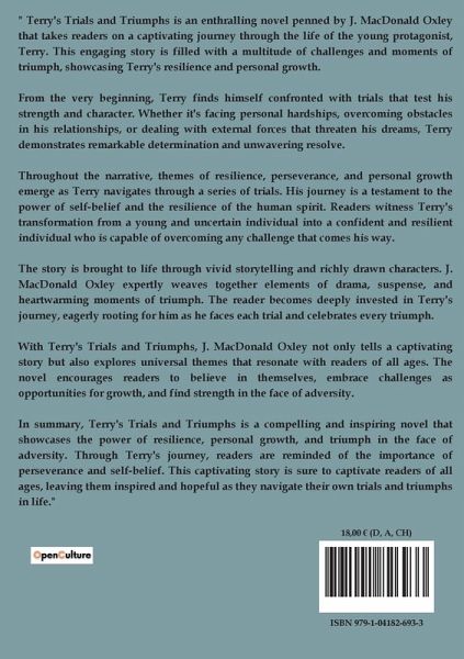 " Terry's Trials and Triumphs is an enthralling novel penned by J. MacDonald Oxley that takes readers on a captivating journey through the life of the young protagonist, Terry. This engaging story is filled with a multitude of challenges and moments of triumph, showcasing Terry's resilience and personal growth. From the very beginning, Terry finds himself confronted with trials that test his strength and character. Whether it's facing personal hardships, overcoming obstacles in his relationships, or dealing with external forces that threaten his dreams, Terry demonstrates remarkable determination and unwavering resolve. Throughout the narrative, themes of resilience, perseverance, and personal growth emerge as Terry navigates through a series of trials. His journey is a testament to the power of self-belief and the resilience of the human spirit. Readers witness Terry's transformation from a young and uncertain individual into a confident and resilient individual who is capable of overcoming any challenge that comes his way. The story is brought to life through vivid storytelling and richly drawn characters. J. MacDonald Oxley expertly weaves together elements of drama, suspense, and heartwarming moments of triumph. The reader becomes deeply invested in Terry's journey, eagerly rooting for him as he faces each trial and celebrates every triumph. With Terry's Trials and Triumphs, J. MacDonald Oxley not only tells a captivating story but also explores universal themes that resonate with readers of all ages. The novel encourages readers to believe in themselves, embrace challenges as opportunities for growth, and find strength in the face of adversity. In summary, Terry's Trials and Triumphs is a compelling and inspiring novel that showcases the power of resilience, personal growth, and triumph in the face of adversity. Through Terry's journey, readers are reminded of the importance of perseverance and self-belief. This captivating story is sure to captivate readers of all ages, leaving them inspired and hopeful as they navigate their own trials and triumphs in life."