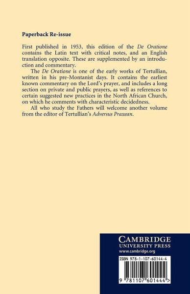 First published in 1953, this edition of the De Oratione contains the Latin text with critical notes, and an English translation opposite. These are supplemented by an introduction and commentary. The De Oratione is one of the early works of Tertullian, written in his pre-Montanist days. It contains the earliest known commentary on the Lord's prayer, and includes a long section on private and public prayers, as well as references to certain suggested new practices in the North African Church, on which he comments with characteristic decidedness. All who study the Fathers will welcome another volume from the editor of Tertullian's Adversus Praxean.