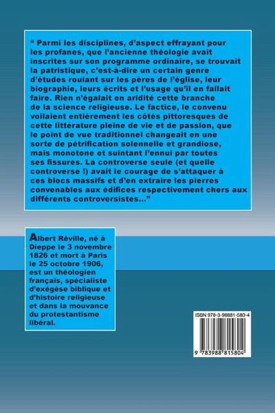 " Parmi les disciplines, d'aspect effrayant pour les profanes, que l'ancienne théologie avait inscrites sur son programme ordinaire, se trouvait la patristique, c'est-à-dire un certain genre d'études roulant sur les pères de l'église, leur biographie, leurs écrits et l'usage qu'il en fallait faire. Rien n'égalait en aridité cette branche de la science religieuse. Le factice, le convenu voilaient entièrement les côtés pittoresques de cette littérature pleine de vie et de passion, que le point de vue traditionnel changeait en une sorte de pétrification solennelle et grandiose, mais monotone et suintant l'ennui par toutes ses fissures. La controverse seule (et quelle controverse !) avait le courage de s'attaquer à ces blocs massifs et d'en extraire les pierres convenables aux édifices respectivement chers aux différents controversistes..."