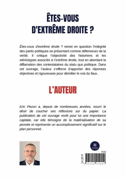 Êtes-vous d'extrême droite ? remet en question l'intégrité des partis politiques se présentant comme défenseurs de la vérité. Il critique l¿objectivité des historiens et les stéréotypes associés à l¿extrême droite, tout en abordant la diffamation des contestataires du statu quo politique. Dans cet ouvrage, l¿auteur s¿efforce d¿apporter des réponses objectives et rigoureuses pour démêler le vrai du faux.