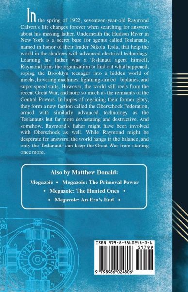 In the spring of 1922, seventeen-year-old Raymond Calvert's life changes forever when searching for answers about his missing father. Underneath the Hudson River in New York is a secret base for agents called Teslanauts, named in honor of their leader Nikola Tesla, that help the world in the shadows with advanced electrical technology. Learning his father was a Teslanaut agent himself, Raymond joins the organization to find out what happened, roping the Brooklyn teenager into a hidden world of mechs, hovering machines, lightning-armed biplanes, and super-speed suits. However, the world still reels from the recent Great War, and none so much as the remnants of the Central Powers. In hopes of regaining their former glory, they form a new faction called the Oberschock Federation, armed with similarly advanced technology as the Teslanauts but far more devastating and destructive. And somehow, Raymond's father might have been involved with Oberschock as well. ¿While Raymond might be desperate for answers, the world hangs in the balance, and only the Teslanauts can keep the Great War from starting once more.