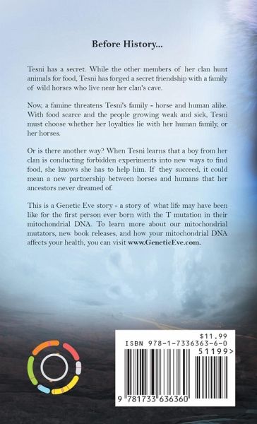 Before History... Tesni has a secret. While the other members of her clan hunt animals for food, Tesni has forged a secret friendship with a family of wild horses who live near her clan's cave. Now, a famine threatens Tesni's family - horse and human alike. With food scarce and the people growing weak and sick, Tesni must choose whether her loyalties lie with her human family, or her horses. Or is there another way? When Tesni learns that a boy from her clan is conducting forbidden experiments into new ways to find food, she knows she has to help him. If they succeed, it could mean a new partnership between horses and humans that her ancestors never dreamed of. This is a Genetic Eve story - a story of what life may have been like for the first person ever born with the T mutation in their mitochondrial DNA. To learn more about our mitochondrial mutators, new book releases, and how your mitochondrial DNA affects your health, you can visit www.GeneticEve.com.