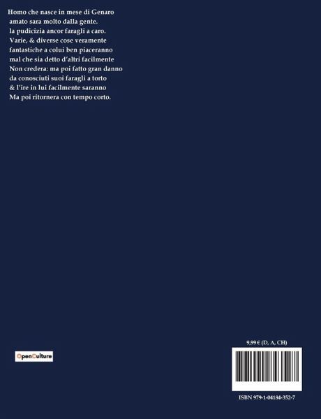 Homo che nasce in mese di Genaro amato sara molto dalla gente. la pudicizia ancor faragli a caro. Varie, & diverse cose veramente fantastiche a colui ben piaceranno mal che sia detto d¿altri facilmente Non credera: ma poi fatto gran danno da conosciuti suoi faragli a torto & l¿ire in lui facilmente saranno Ma poi ritornera con tempo corto.