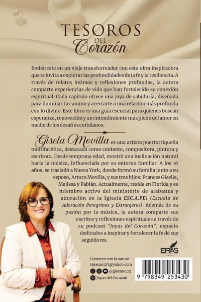 Embárcate en un viaje transformador con esta obra inspiradora que te invita a explorar las profundidades de la fe y la resiliencia. A través de relatos íntimos y reflexiones profundas, la autora comparte experiencias de vida que han fortalecido su conexión espiritual. Cada capítulo ofrece una joya de sabiduría, diseñada para iluminar tu camino y acercarte a una relación más profunda con lo divino. Este libro es una guía esencial para quienes buscan esperanza, renovación y un entendimiento más pleno del amor en medio de los desafíos cotidianos. SOBRE LA AUTORA Gisela Movilla es una artista puertorriqueña multifacética, destacada como cantante, compositora, pintora y escritora. Desde temprana edad, mostró una inclinación natural hacia la música, influenciada por su entorno familiar. A los 16 años, se trasladó a Nueva York, donde formó su familia junto a su esposo, Arturo Movilla, y sus tres hijos: Frances Giselle, Melissa y Fabián. Actualmente, reside en Florida y es miembro activo del ministerio de alabanza y adoración en la iglesia ESC.A.PE! (Escuela de Adoración Peregrinos y Extranjeros). Además de su pasión por la música, la autora comparte sus escritos y reflexiones espirituales a través de su podcast "Tesoros del Corazón", espacio dedicados a inspirar y fortalecer la fe de sus seguidores.
