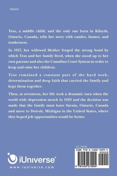 Tess, a middle child, and the only one born in Kilsyth, Ontario, Canada, tells her story with candor, humor, and tenderness. In 1917, her widowed Mother forged the strong bond by which Tess and her family lived, when she stood up to her own parents and also the Canadian Court System in order to keep and raise her children. Tess remained a constant part of the hard work, determination and deep faith that carried the family and kept them together. Then, at seventeen, her life took a dramatic turn when the world wide depression struck in 1929 and the decision was made that the family must leave Sarnia, Ontario, Canada and move to Detroit, Michigan in the United States, where they hoped job opportunities would be better.