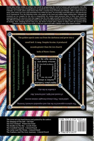 Doctor John Robins strides to achieve true worth by progressing the world of science and mathematics. But after sixty-two exhausting years of insignificance, he spends his days drinking red ale in a hotel bar deep in the mountains of Colorado. As a result, John's mind abuses him with a constant loop of insults and criticism. After a night of two too many, John wakes up to see a bell materialize from within his closet. Its unworldly sound lifts him to a state that he has never experienced. Over the following weeks, orbs appear in his closet and entities begin visiting John. Although the creatures are too complex for his eyes to comprehend, his curious mind pressures John to learn more about his uninvited guests. He uncovers clues that suggest that the orbs might actually be doorways from a higher dimension. The different entities start competing for John's trust, and he soon finds himself as the key object in a momentous game of strategy. Now, drinking heavier than ever, the doctor is faced with a chance to either solve the mystery of the visitations and achieve true worth, or fail once again and suffer a lifetime more of his mind's torment.