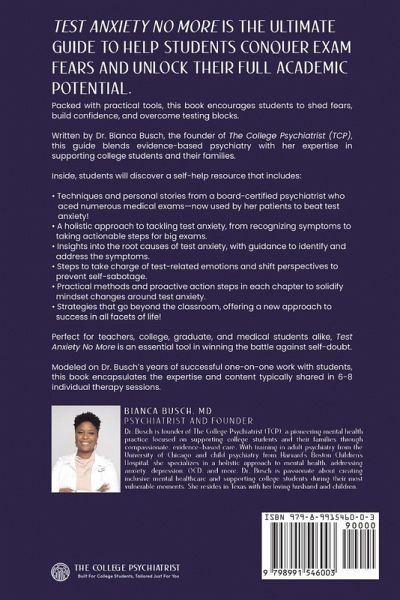 Test Anxiety No More is the ultimate guide to help students conquer exam fears and unlock their full academic potential. Packed with practical tools, this book encourages students to shed fears, build confidence, and overcome testing blocks. Written by Dr. Bianca Busch, the founder of The College Psychiatrist (TCP) , this guide blends evidence-based psychiatry with her expertise in supporting college students and their families. Inside, students will discover a self-help resource that includes: Techniques and personal stories from a board-certified psychiatrist who aced numerous medical exams-now used by her patients to beat test anxiety!A holistic approach to tackling test anxiety, from recognizing symptoms to taking actionable steps for big exams.Insights into the root causes of test anxiety, with guidance to identify and address the symptoms.Steps to take charge of test-related emotions and shift perspectives to prevent self-sabotage.Practical methods and proactive action steps in each chapter to solidify mindset changes around test anxiety.Strategies that go beyond the classroom, offering a new approach to success in all facets of life! Perfect for teachers, college, graduate, and medical students alike, Test Anxiety No More is an essential tool in winning the battle against self-doubt. Modeled on Dr. Busch's years of successful one-on-one work with students, this book encapsulates the expertise and content typically shared in 6-8 individual therapy sessions. Bianca Busch, M.D., is the founder of The College Psychiatrist (TCP), a pioneering mental health practice focused on supporting college students and their families through compassionate, evidence-based care. With training in adult psychiatry from the University of Chicago and child psychiatry from Harvard's Boston Children's Hospital, she specializes in a holistic approach to mental health, addressing anxiety, depression, OCD, and more. Dr. Busch is passionate about creating inclusive mental healthcare and supporting college students during their most vulnerable moments. She resides in Texas with her loving husband and children.